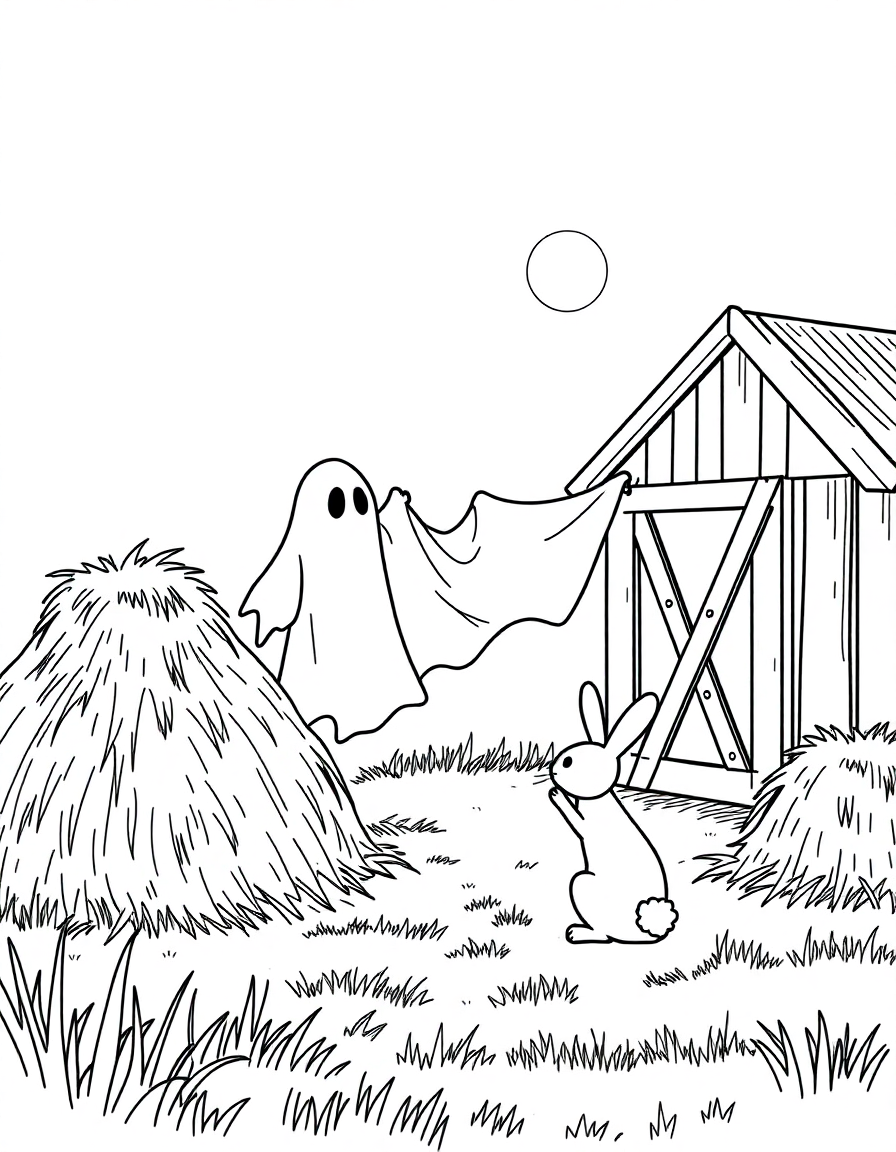 A farm’s haystacks where a ghost tosses a bedsheet to spook a rabbit under moonlight by the barn door.