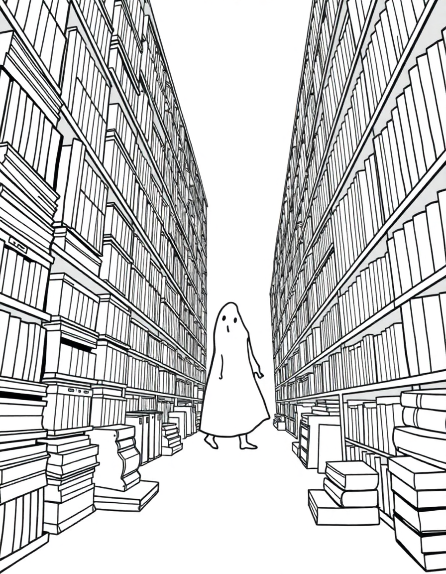 Between tall library stacks where a gust flips many books to the same page as a ghost passes.