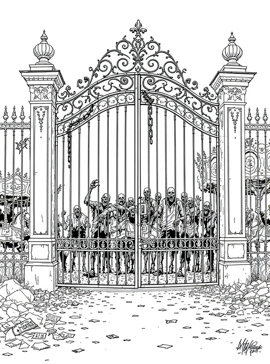 The gate of an abandoned amusement park where zombies shamble from behind the carousel and tickets litter the ground.