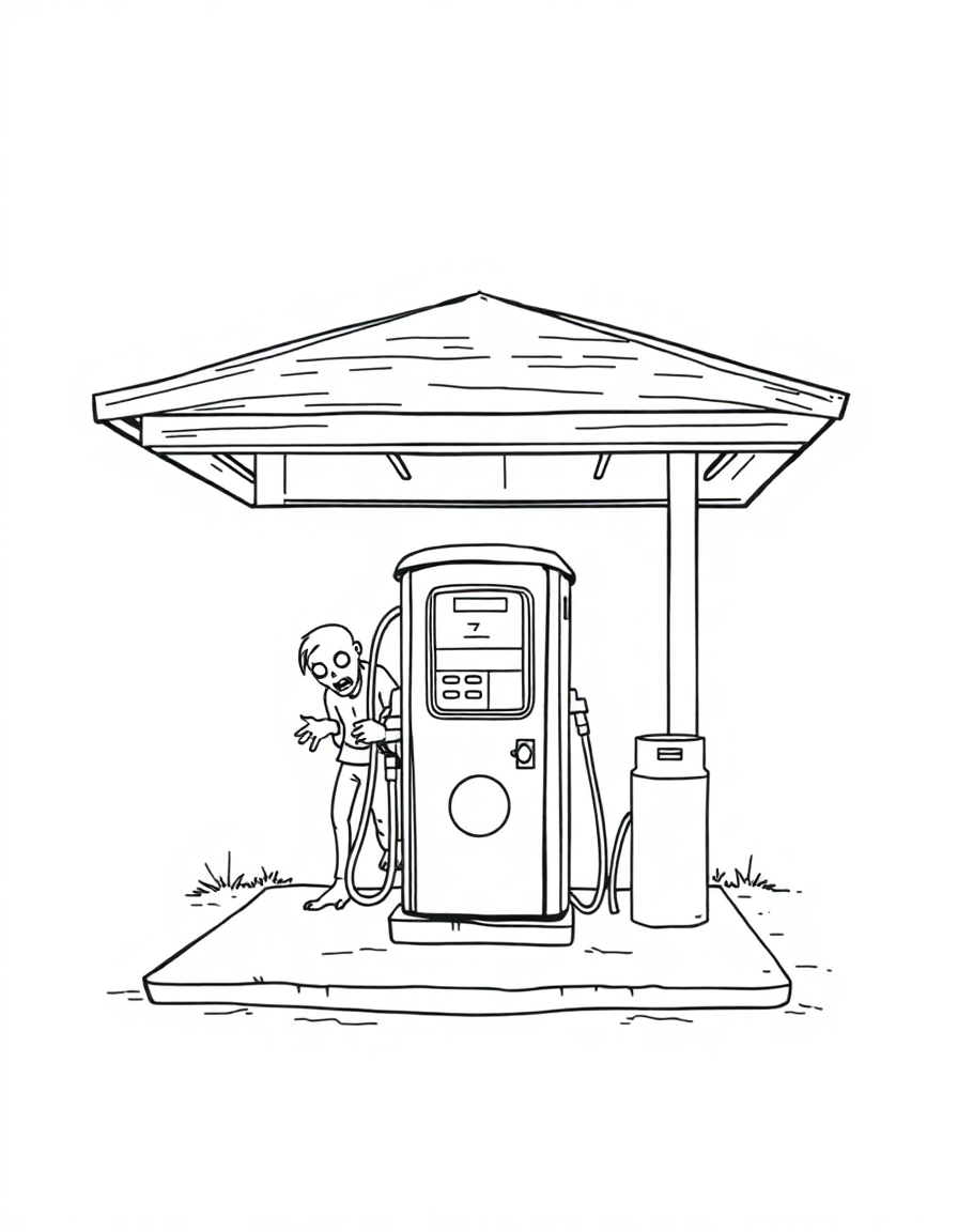 A rural gas station where zombies circle an old pump and a door charm sways.