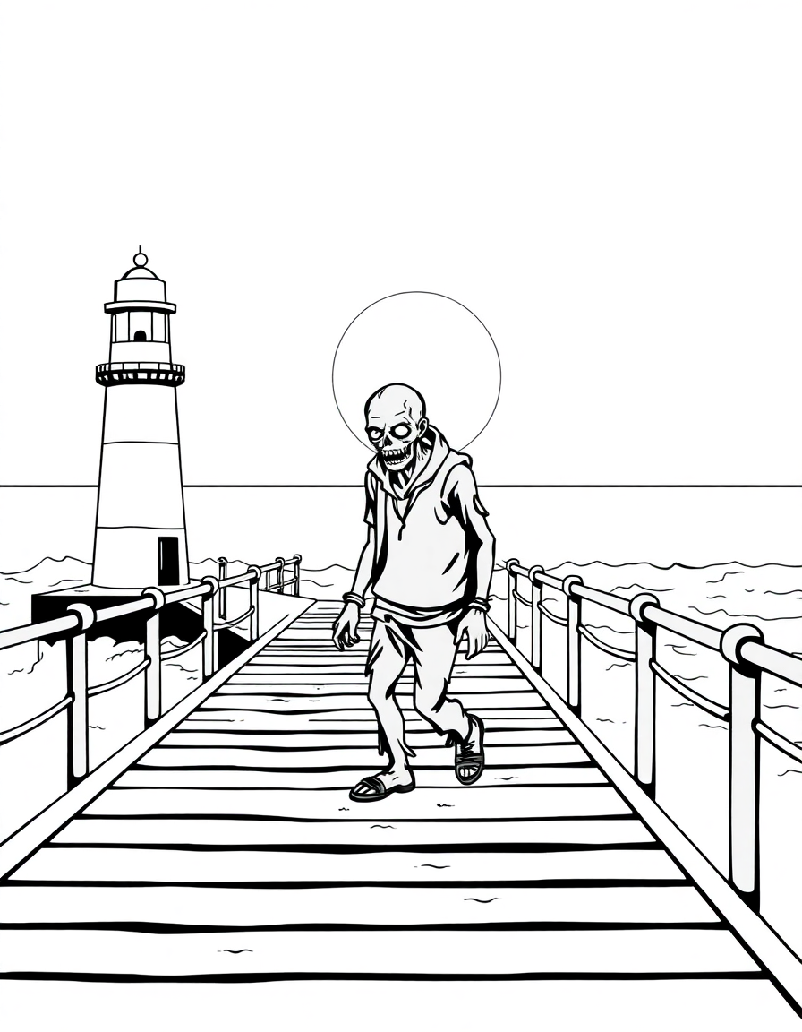 A seaside boardwalk at sunrise where a zombie trudges toward a lighthouse as waves crash.