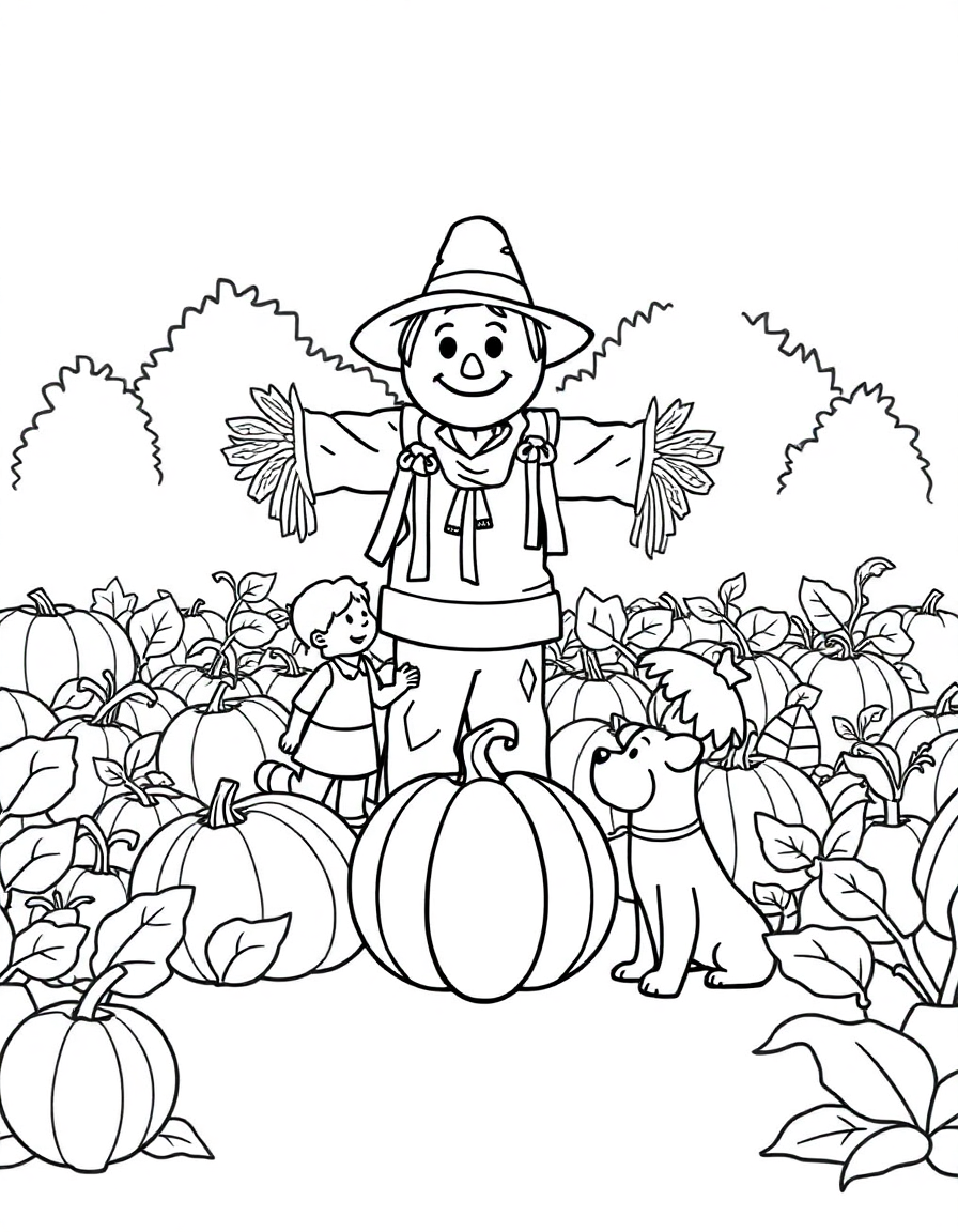 A pumpkin patch where children hang ribbons on a friendly-faced scarecrow as a dog watches.