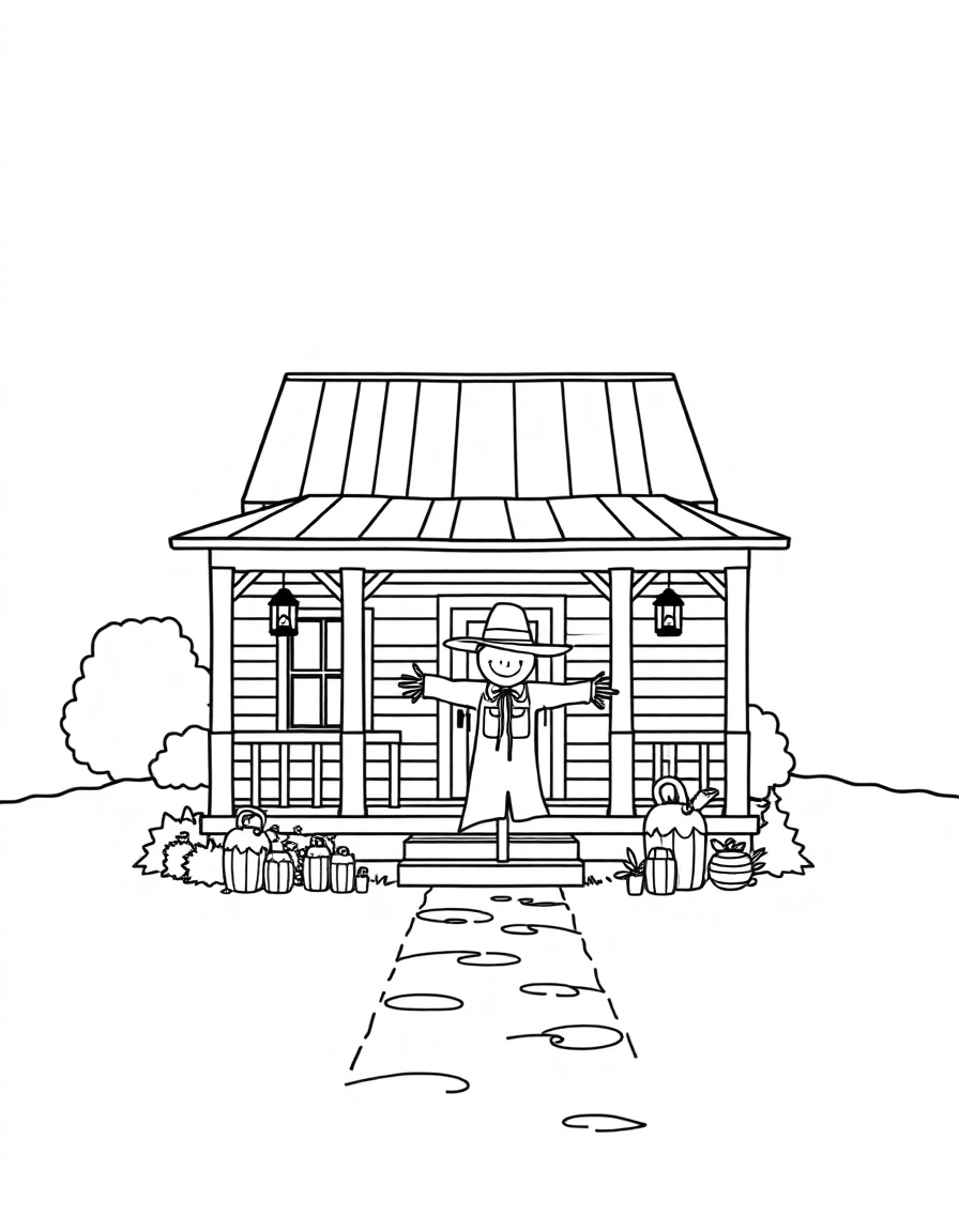 A farmhouse porch facing a scarecrow in the yard while lanterns flicker along the path.
