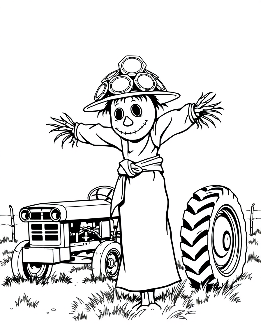 A scarecrow crowned with tin pot lids rattling in the wind beside a rusty tractor.