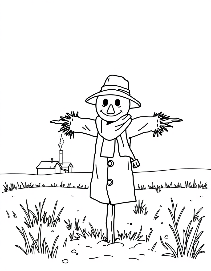A scarecrow in a snow-dusted field wearing a scarf and bucket hat while smoke curls from chimneys.