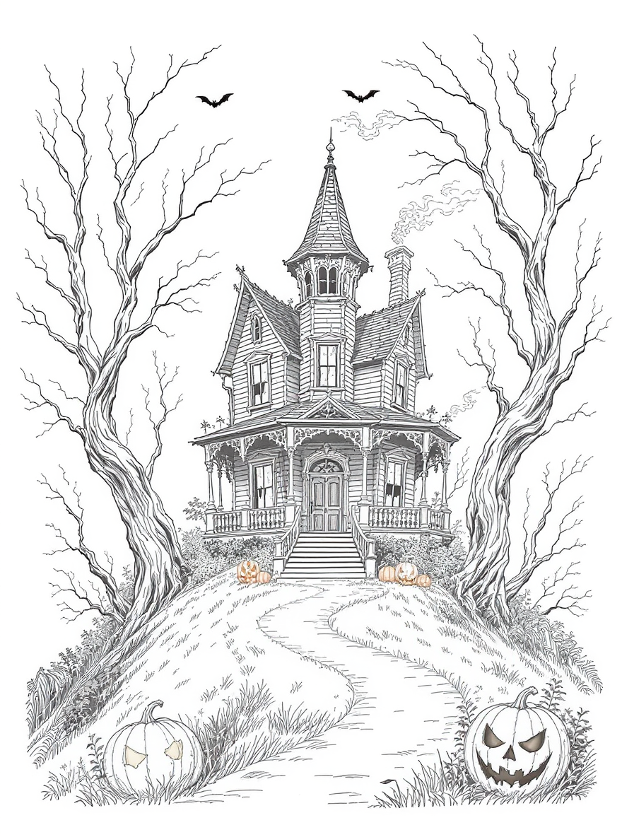 Haunted Victorian house on a hill with crooked trees and bats, glowing jack-o’-lanterns on the steps