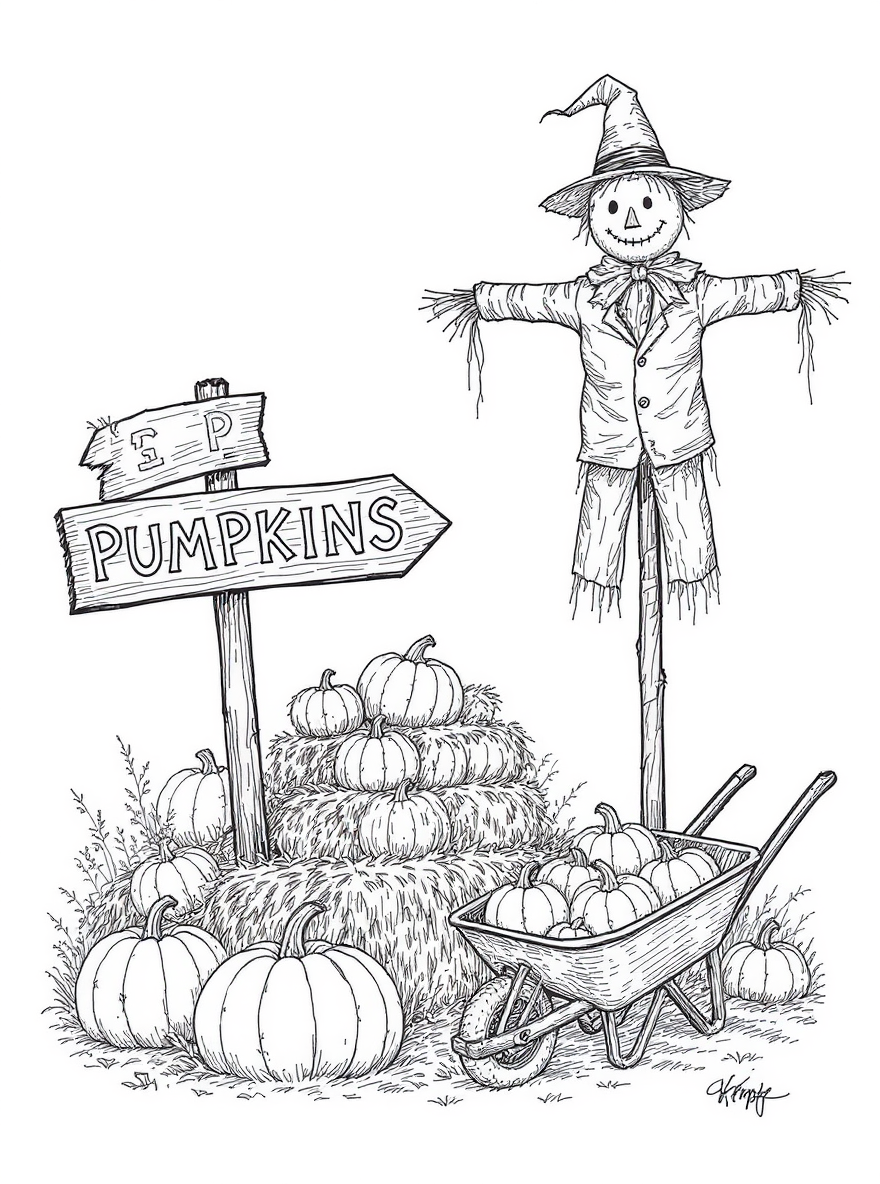 Pumpkin patch with scarecrow, wooden sign, stacked hay bales, and a wheelbarrow of gourds
