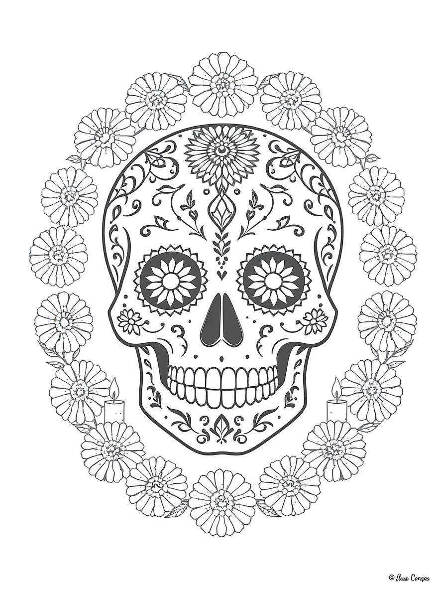 Day-of-the-Dead inspired sugar skull with flowers, marigold wreath, candles