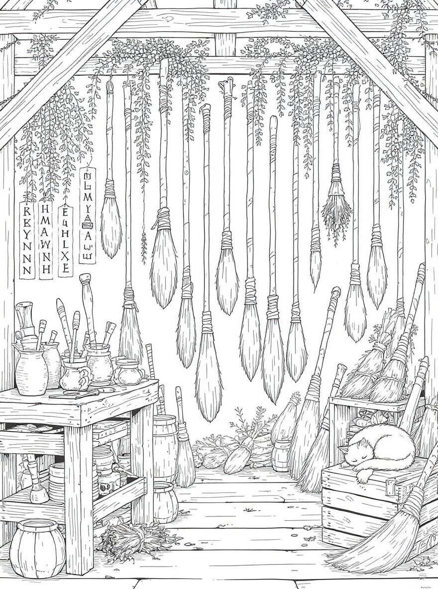 Magic broom workshop: racks of brooms, tool bench, rune tags, hanging herbs, sleeping cat