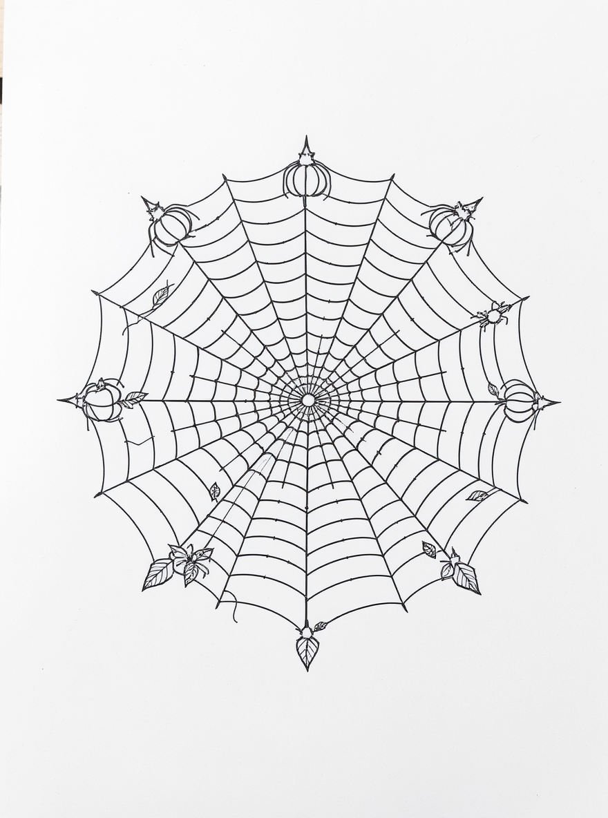 Spider web mandala with symmetrical pumpkins, leaves, tiny spiders at the edges