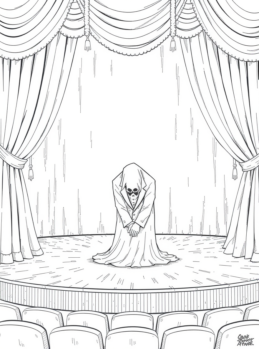 An abandoned theater stage where a ghost bows through red curtains toward rows of empty seats.