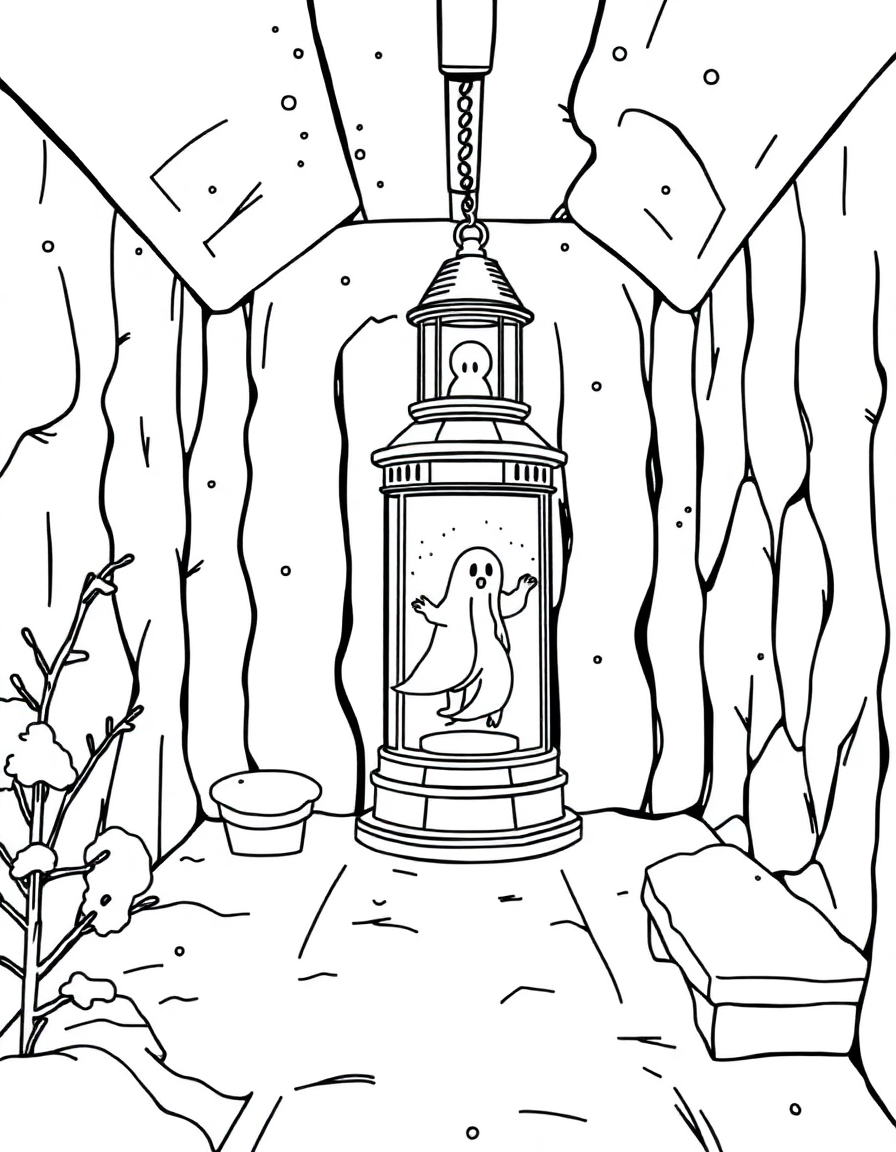 A snowy lighthouse lantern room where a ghost circles the light guiding a distant boat. — Halloween Coloring Page | Halloween Coloring Pages