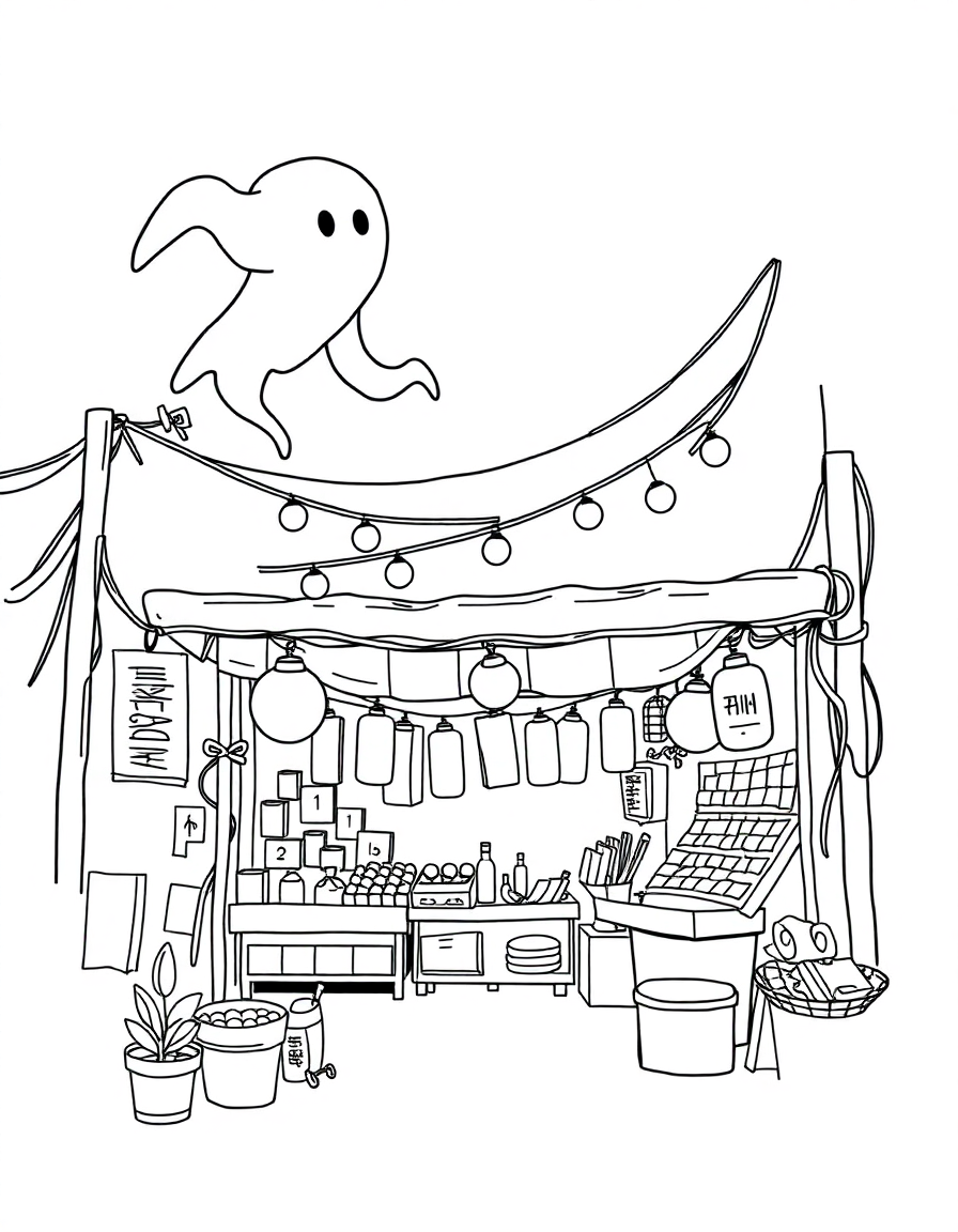 Above a night-market stall where a ghost billows the canopy and string lights sway.