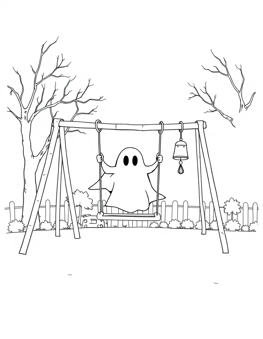 An elementary playground where a ghost pushes an empty swing and a chime hangs from the slide.